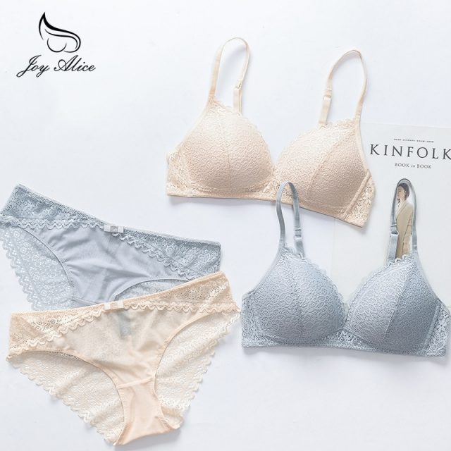 Lace Patchwork Lingerie Bra and Briefs Set Wire Free Thin Cup Underwear for Women