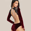 Indulge in the timeless charm of our Backless Velvet Lace Bodysuit in a captivating burgundy shade. This elegant piece seamlessly blends vintage style with modern sensuality, perfect for those who appreciate both grace and allure. The rich velvet fabric combined with intricate lace detailing creates a sophisticated silhouette, making it a must-have addition to any wardrobe.