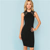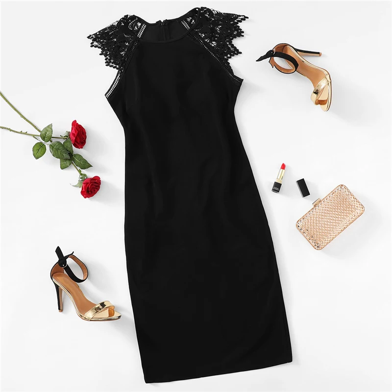 This bodycon dress is crafted to enhance your natural curves, offering a sleek and seductive silhouette. The contrast lace insert adds an element of intrigue and allure, setting this dress apart from the rest. The sleeveless design and natural waistline ensure a comfortable fit, while the solid black color adds a timeless touch of elegance.