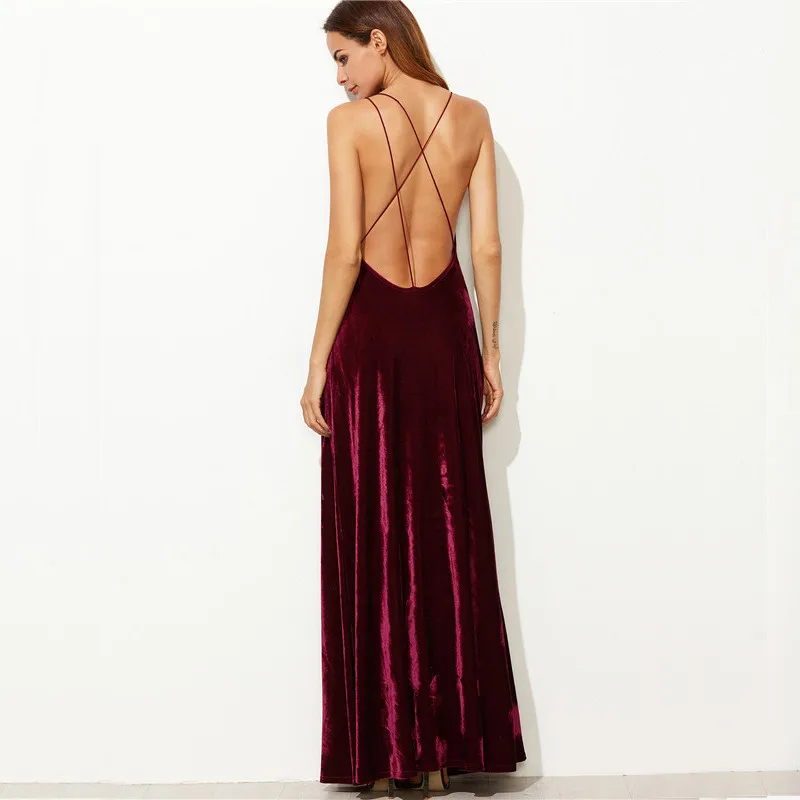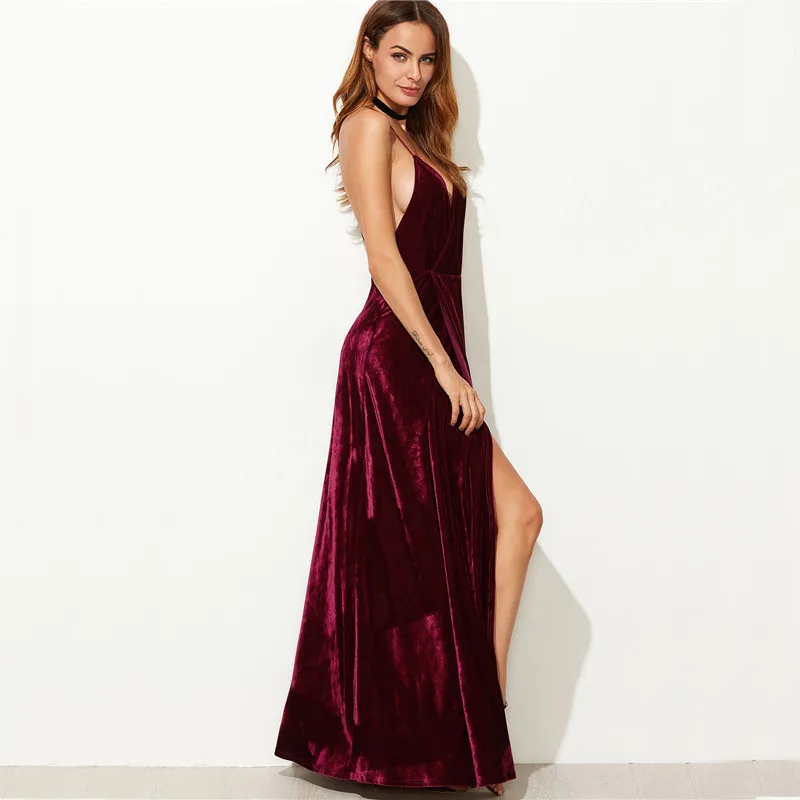 Burgundy Velvet Maxi Dress Womens Backless Deep V Neck Elegant Wrap Strappy