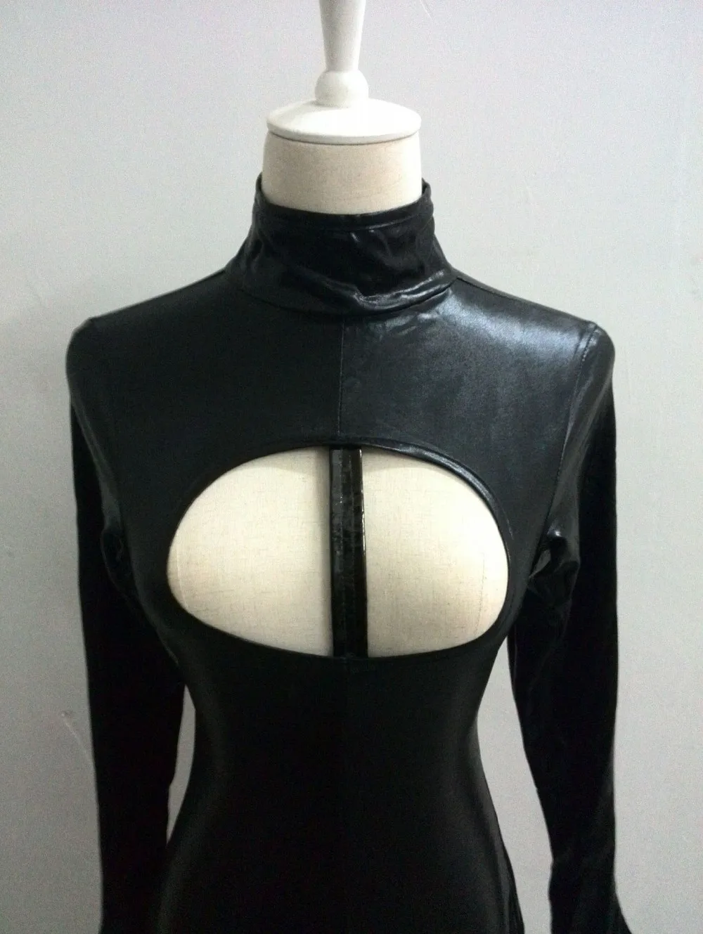 Embrace the feline fantasy with this versatile leather jumpsuit costume. It’s not just for Halloween or comic conventions; it’s a piece that fits well into role-playing scenarios or any occasion that calls for a little extra excitement. The bondage catsuit outfit aspect offers an additional layer of intrigue, ensuring you leave a lasting impression.