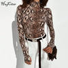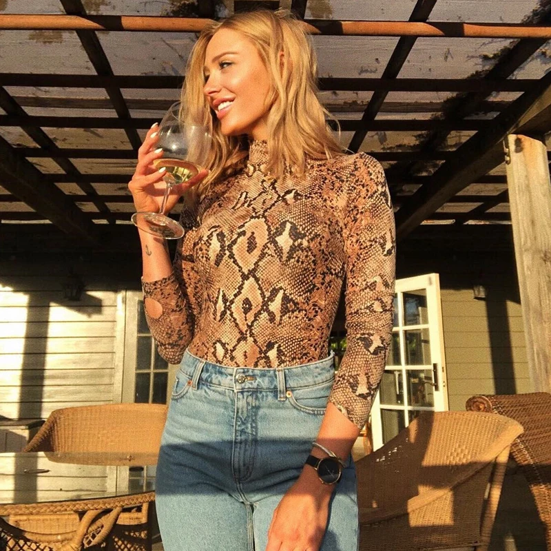 Hugcitar high neck long sleeve sexy bodycon snakeskin bodysuit 2018 autumn winter women fashion body