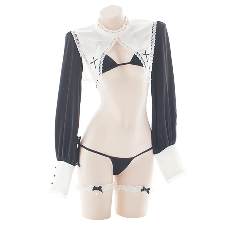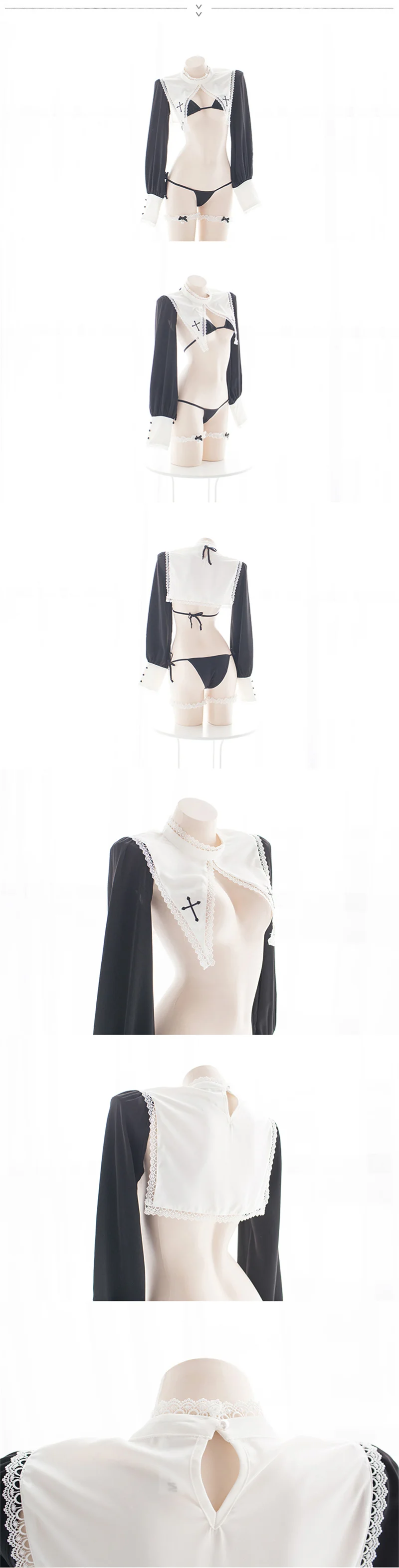 Crafted with a keen eye for detail, this nun cosplay costume combines luxurious lace patchwork with tantalizing hollow-out designs and a hot bikini suit. Every element is tailored to enhance your curves while ensuring a comfortable fit, making it ideal for long hours of role-play or themed events. The costume includes: