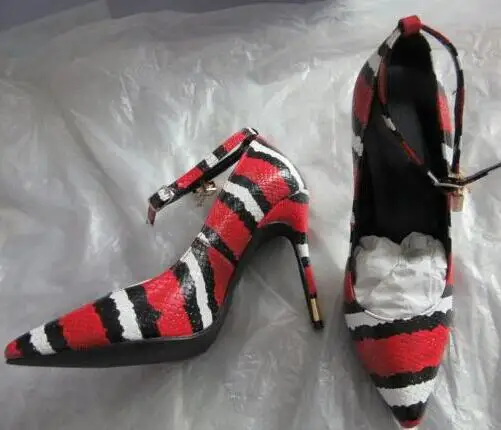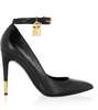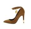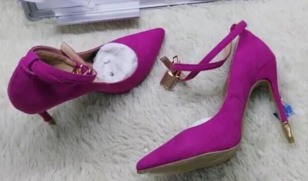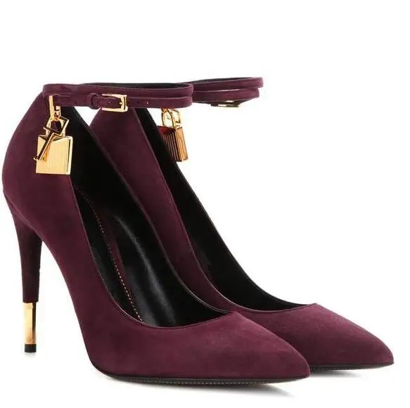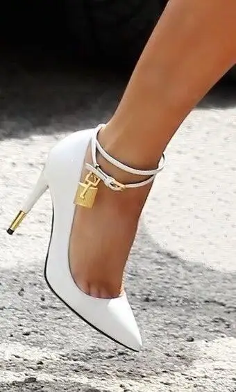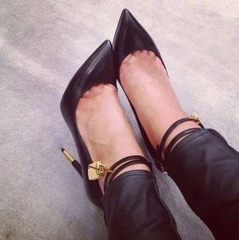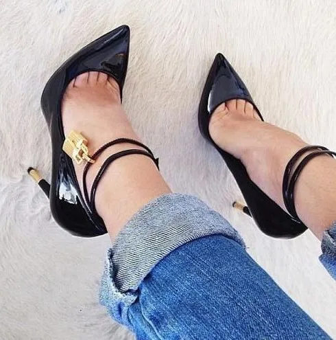 These black patent leather stiletto heels feature a glossy finish that exudes luxurious charm, while the pointy toe design adds a touch of elegance. With an ankle strap adorned with metal lock ankle buckles, they ensure a secure and comfortable fit, allowing you to strut with confidence and poise.