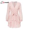 Unleash your inner fashionista with this Vintage Polka Dot Pink Ruffle Dress. Perfect for those who appreciate the charm of retro polka dot fashion, this dress combines timeless elegance with a flirty modern vibe. Its unique design features a mesh long sleeve, offering a peek of skin for a subtly sexy touch, while the layered mini robe style creates an alluring silhouette.