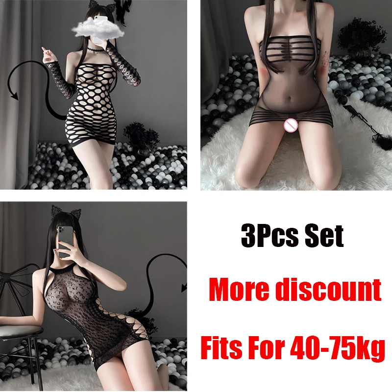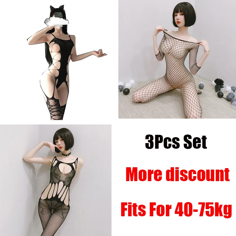 Women's 3-Piece Sexy Lingerie Set Open Crotch Stretch Mesh Bodystockings 16 Teddy Bear Bodysuit Sexy Set Plus Size Lingerie